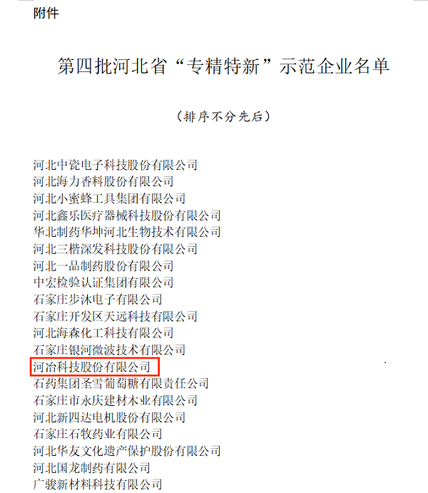 2021年12月30日,河北省工業(yè)和信息化廳發(fā)布了《關(guān)于公布第四批河北省“專精特新”示范企業(yè)的通知》(冀工信企業(yè)函〔2021〕1029號)。通過前期申報,河冶科技股份有限公司通過了市級、省級的嚴(yán)格審核,被認定為河北省“專精特新”示范企業(yè)。