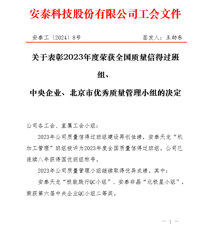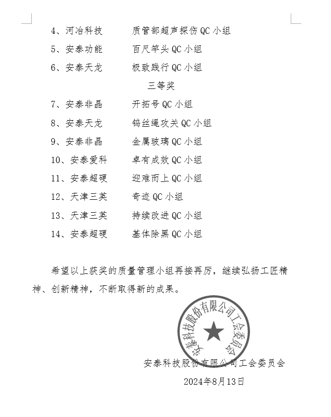 為鼓勵員工參與質量提升及改善活動,提高質量意識和創(chuàng)新能力,持續(xù)進行質量改善、降低消耗、提高工作效率,河冶科技-質管部超聲探傷QC小組榮獲中央企業(yè)、北京市優(yōu)秀質量管理小組三等獎, 2023年安泰科技第十一屆優(yōu)秀質量管理小組二等獎。