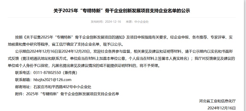 近日,公司憑借在專業領域內的持續深耕與創新,再度榮獲河北省“專精特新”示范企業認定。這一榮譽的再次獲得,不僅是對公司長期以來堅持專業化、精細化、特色化、新穎化發展道路的肯定,更是對公司不斷創新、追求卓越精神的認可。
